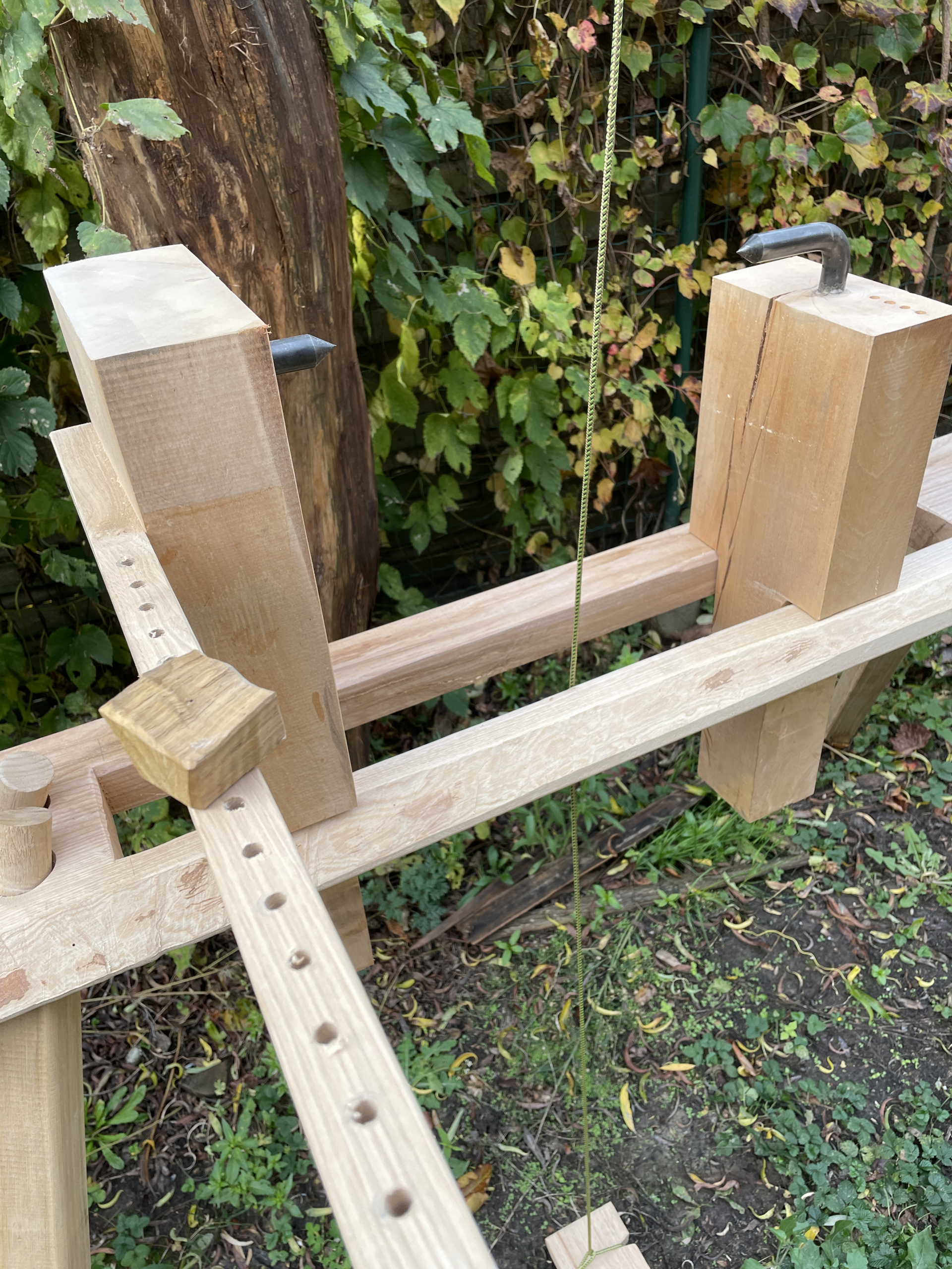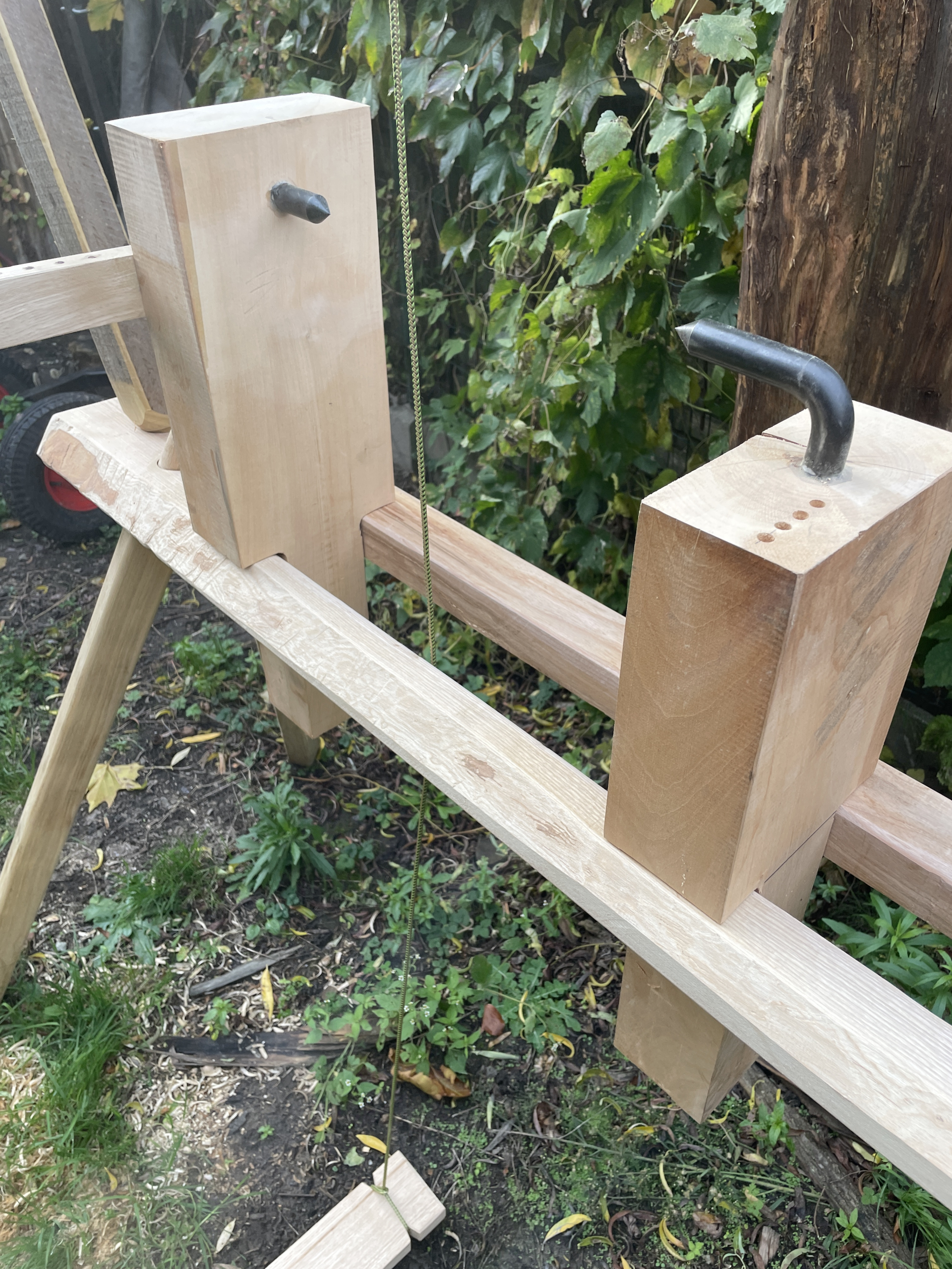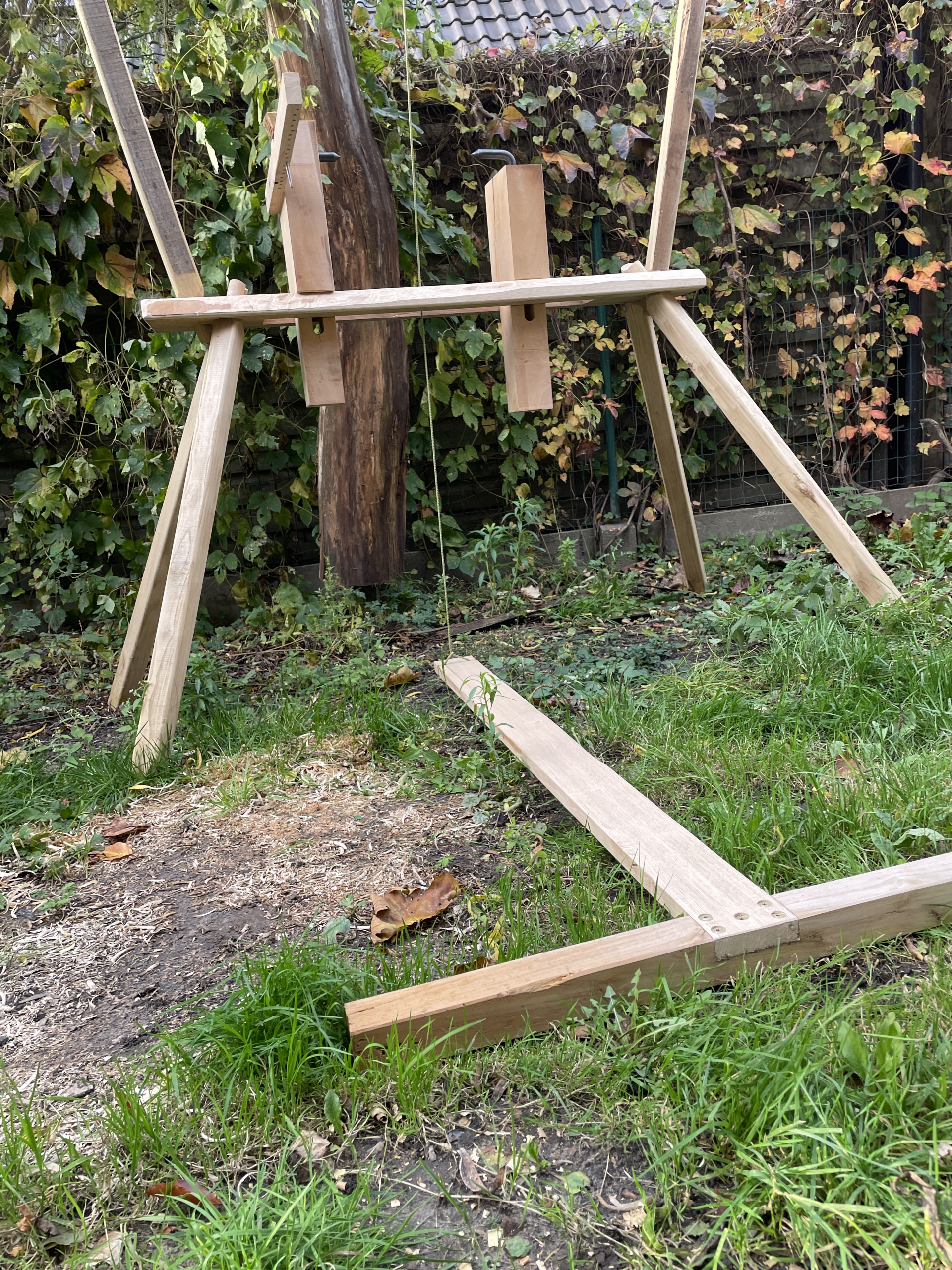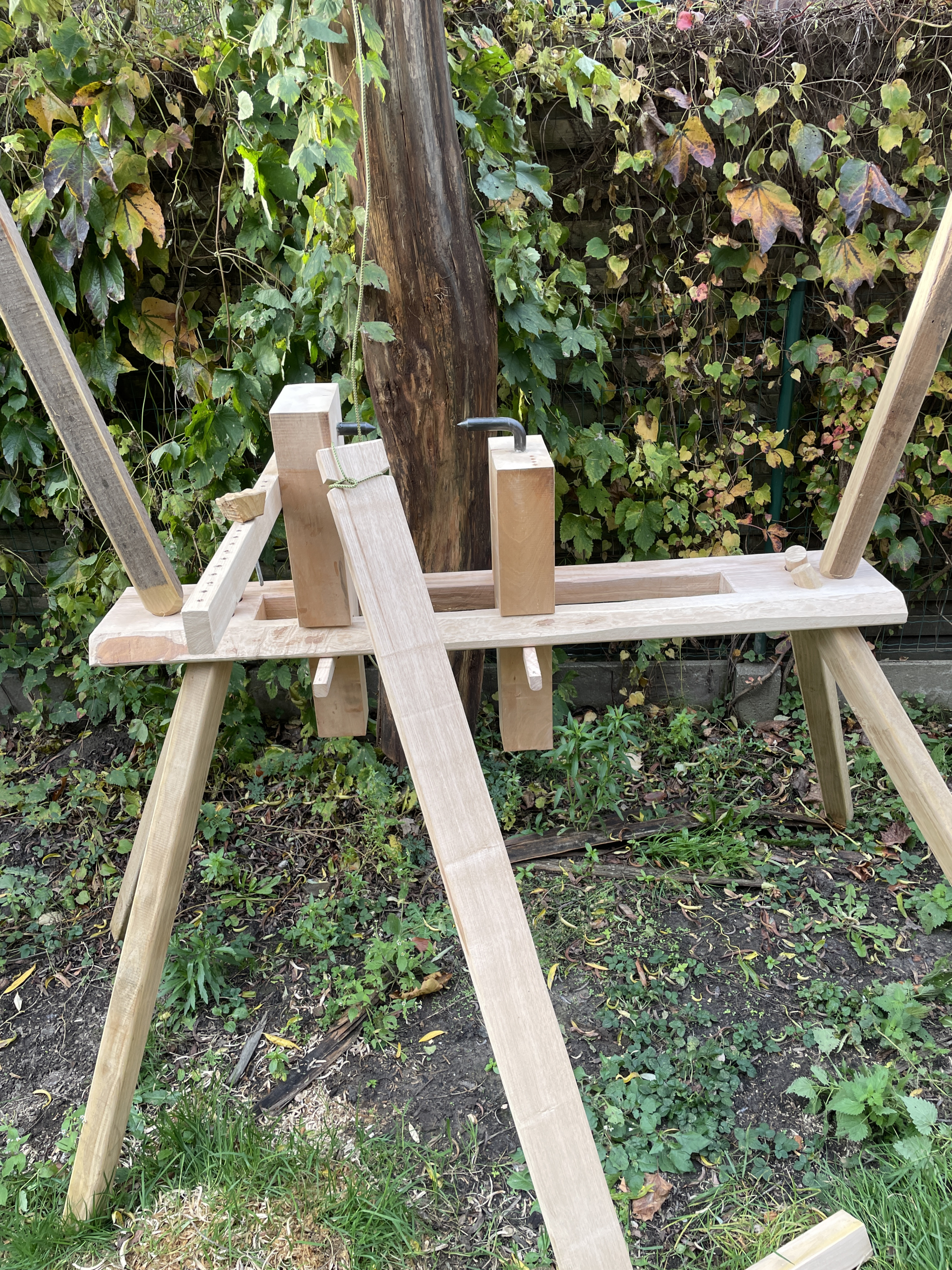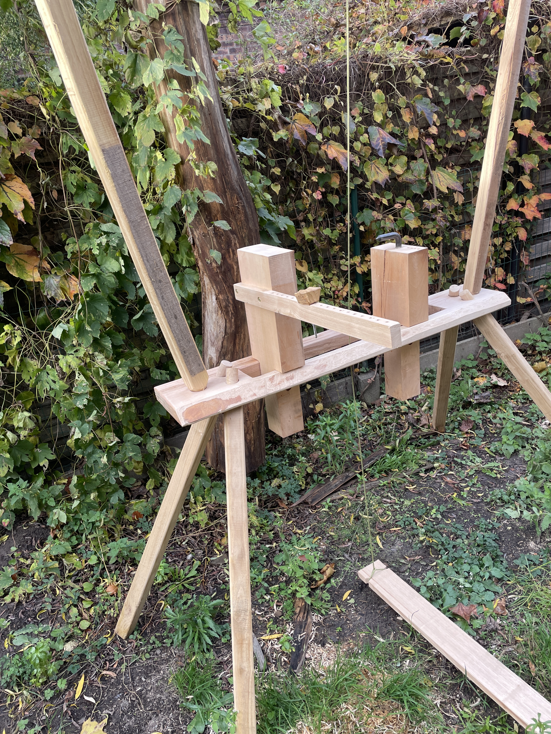 Een wipdraaibank, gemaakt in Wetteren uit lokaal hardhout (Tamme Kastanje of Amerikaase Eik). Deze wipdraaibank is afgeleid van het model dat ik ook gebruik voor mij workshops. Volledig demonteerbaar en vlak op te bergen voor stockage en transport. De bedlengte is maximaal 1,5 m en alle onderdelen passen binnen die lengte.